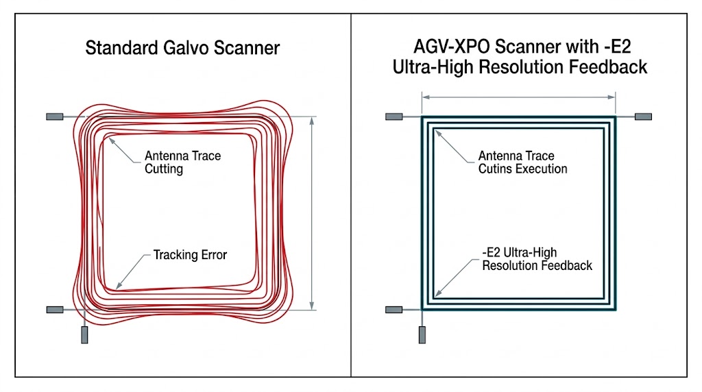 傳統振鏡掃描器在切削時會產生嚴重追蹤誤差,導致圖形失真,先進的 AGV-XPO 掃描器藉由超高解析度回饋,能實現精確、無誤差的天線痕跡切削執行。
