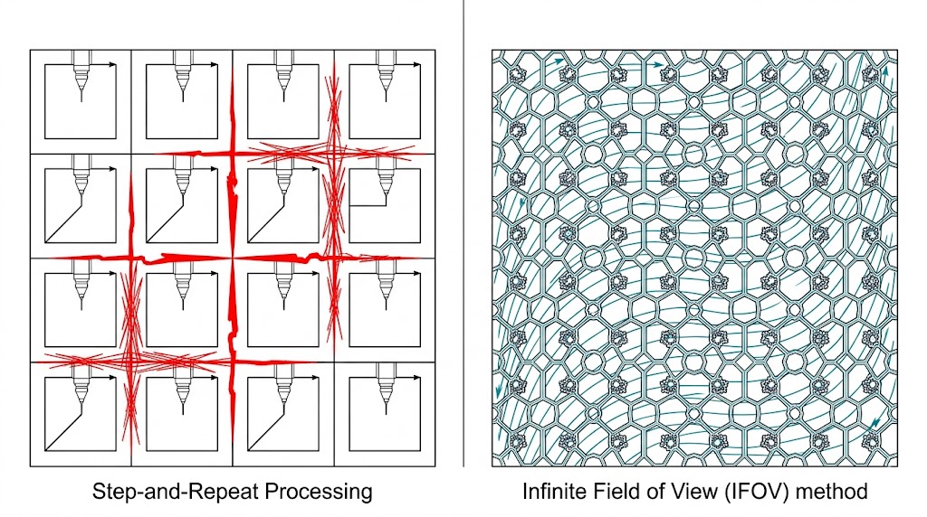 對比步進重複加工(左)在拼縫處產生的誤差(紅線),與無限視場方法(右)連續無縫大面積複雜圖案加工效果。