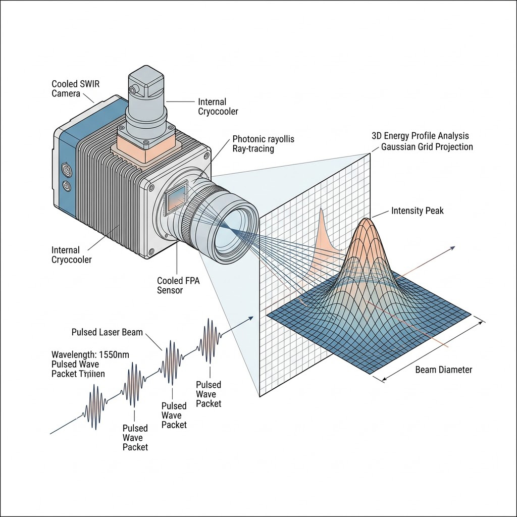 此示意圖展示冷卻式 SWIR 攝影機系統,對波長 1550 奈米的脈衝雷射光束(脈衝波包序列)進行光子射線追蹤,並產出包含強度峰值與光束直徑的 3D 高斯網格投影能量分佈分析。