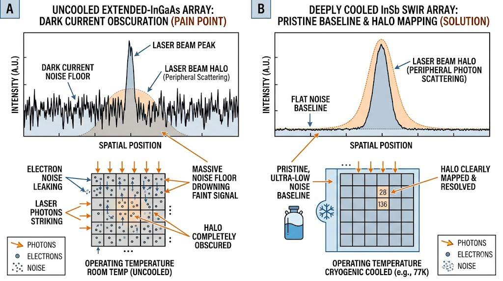 此圖比較非冷卻延伸銦鎵砷 (Extended-InGaAs) 陣列感測器與深冷型銻化銦 (InSb) 短波紅外感測器 (SWIR) 陣列在探測微弱光暈周邊光散射上的性能差異,非冷卻式 (A) 感測器受制於高暗電流雜訊基底,完全遮蔽了微弱光暈,造成探測痛點,深冷型史特林冷卻至 77K 技術 (B) 藉由深低溫冷卻操作與極潔淨低雜訊基線,精確對映解析出微弱散射光暈,完美解決了暗電流遮蔽痛點。