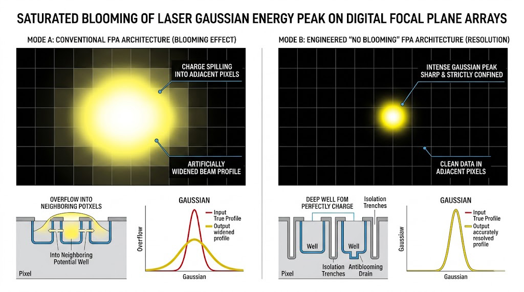 數位焦平面陣列對比雷射能量峰值的光暈效應示意圖:傳統架構(左)電荷溢散致輪廓擴大,先進架構(右)利用隔離結構精確解析並提升解析度。