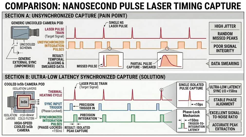 本示意圖對比奈秒脈衝雷射的擷取技術:上圖非同步採樣的未冷卻相機隨機積分,導致嚴重時間交疊失真、數據塗抹及峰值遺失。下圖冷卻式 InSb 相機具備小於 150ns 超低延遲同步及鎖相積分,能精確、單一擷取孤立脈衝,信噪比卓越且峰值提取準確。
