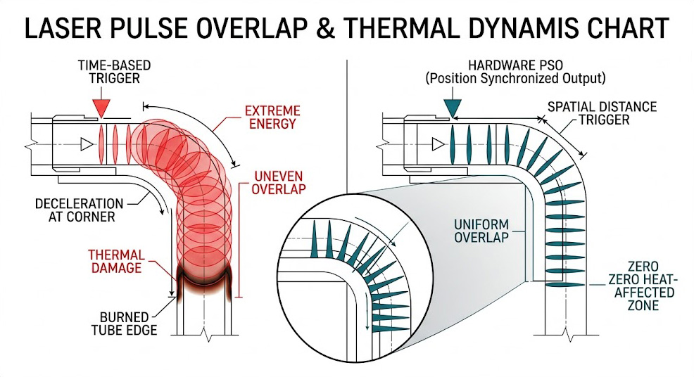 比較雷射轉角熱損:時間觸發導致重疊不均(左);硬體位置同步輸出(PSO)則實現均勻零熱影響區(右)