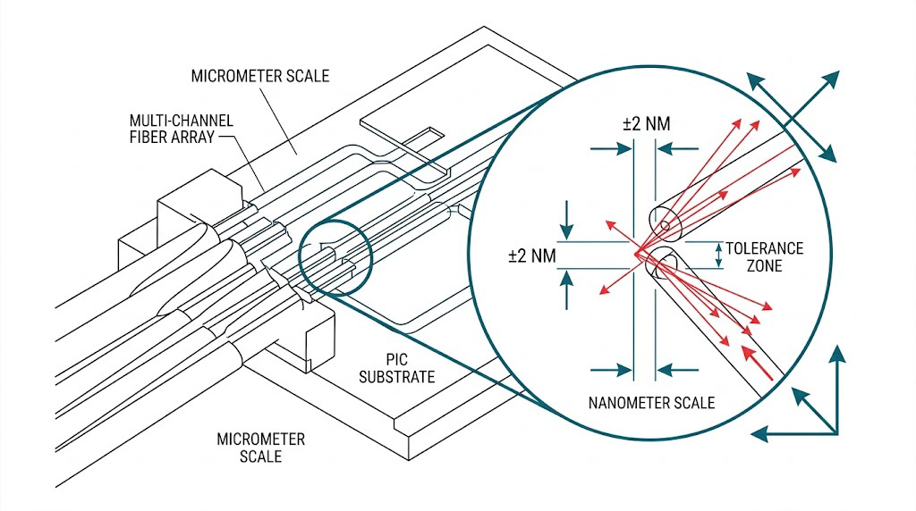 示意圖展示光纖陣列與光子積體電路(PIC)基板之耦合封裝,放大圖強調奈米級(±2 nm)對準公差,突顯主動對準之精密要求,以防止重大的光學插入損耗。