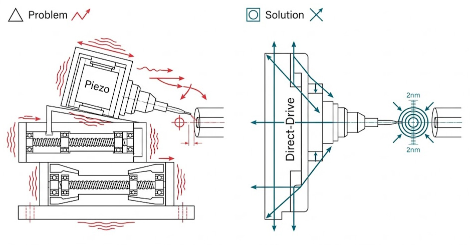 傳統粗微調複合平台(左)存在遲滯陷阱與熱漂移失真,導致光纖端失配,FiberMaxHP 直接驅動平台(右)以絕對剛性與零反向間隙達成 2nm 對齊鎖定。