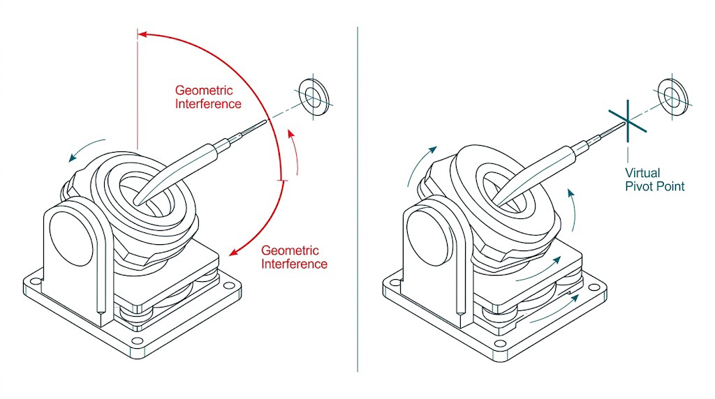此示意圖為多軸耦合幾何干涉分析:左側實體樞軸因耦合偏移產生紅弧干涉錯失目標;右側軟體補償尖端鎖定空間虛擬樞軸點,維持完美光學對位。