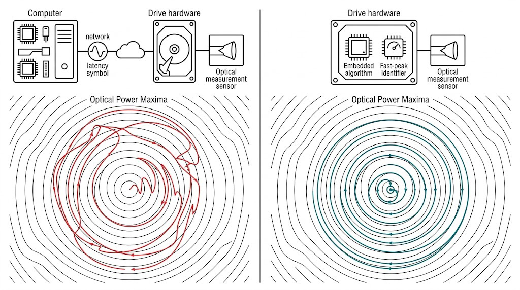外部 PC 系統(左)受通訊延遲影響,尋光軌跡嚴重震盪且收斂困難;嵌入式系統(右)利用驅動硬體級演算法實現精確快速收斂,無過沖。