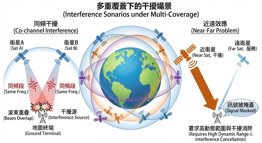 距離地面終端較近的衛星(路徑損耗小)訊號可能過強,掩蓋了距離較遠但負責服務的衛星訊號,這要求終端具備極高的動態範圍與干擾消除能力。