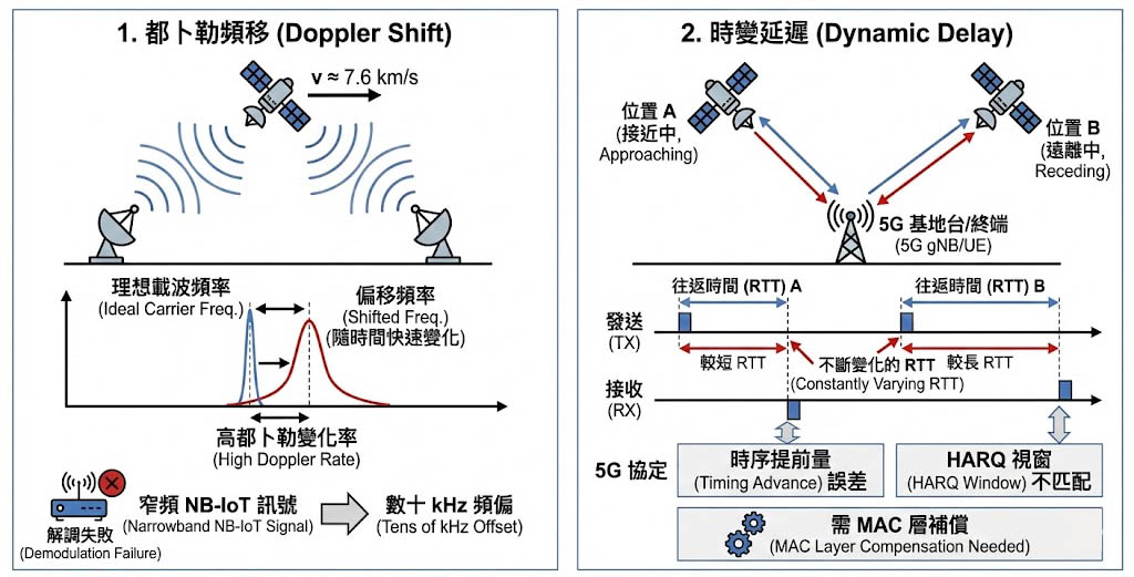 隨著衛星接近與遠離,訊號往返時間(RTT)在不斷變化,這會影響 5G 協定中的時序提前量(Timing Advance)與混合自動重傳請求(HARQ)視窗,必須在 MAC 層進行補償。