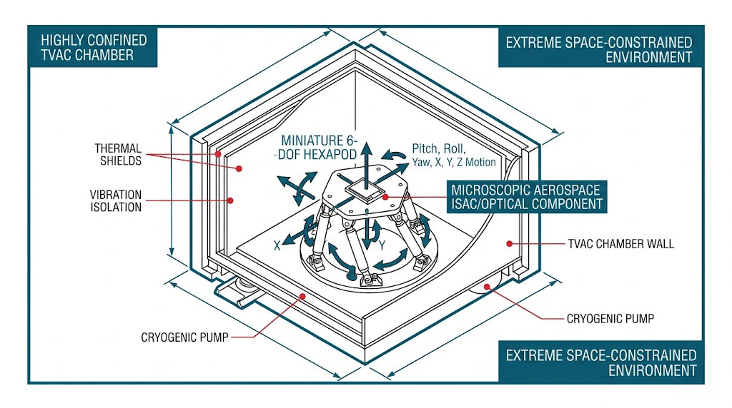 密閉式熱真空腔 (TVAC) 內微型元件測試示意圖。展示微型六自由度併聯機構在極端受限空間下對微型航太元件進行六軸精密動態運動。