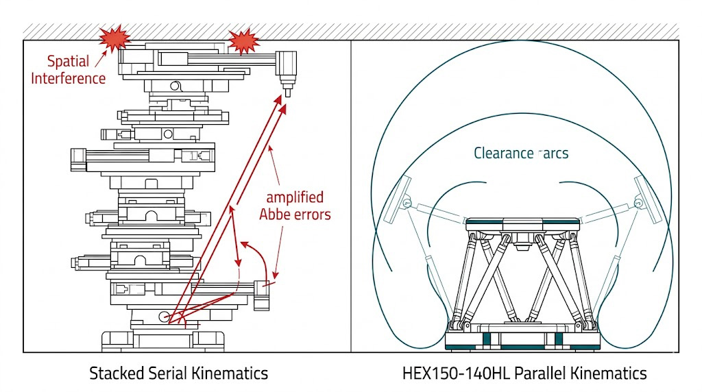 空間限制對比示意圖:左側傳統堆疊式串聯滑台存在空間干涉與放大阿貝誤差,右側HEX150-140HL並聯式平台作動範圍廣且無堆疊誤差。