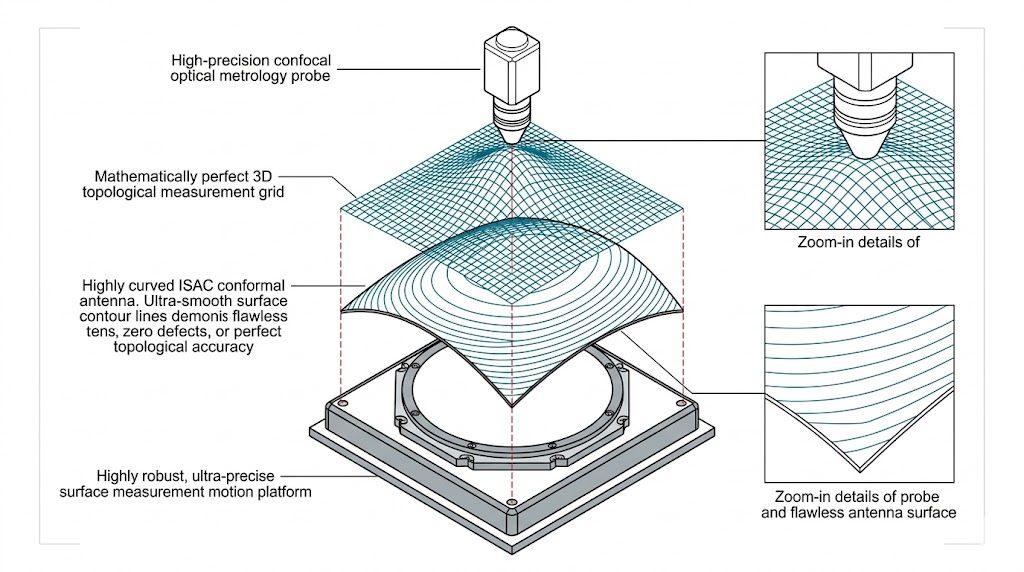 此 ISAC 共形天線展示奈米級拓撲計量,探頭投射完美 3D 網格,運動平台承載,驗證天線表面幾何無瑕。