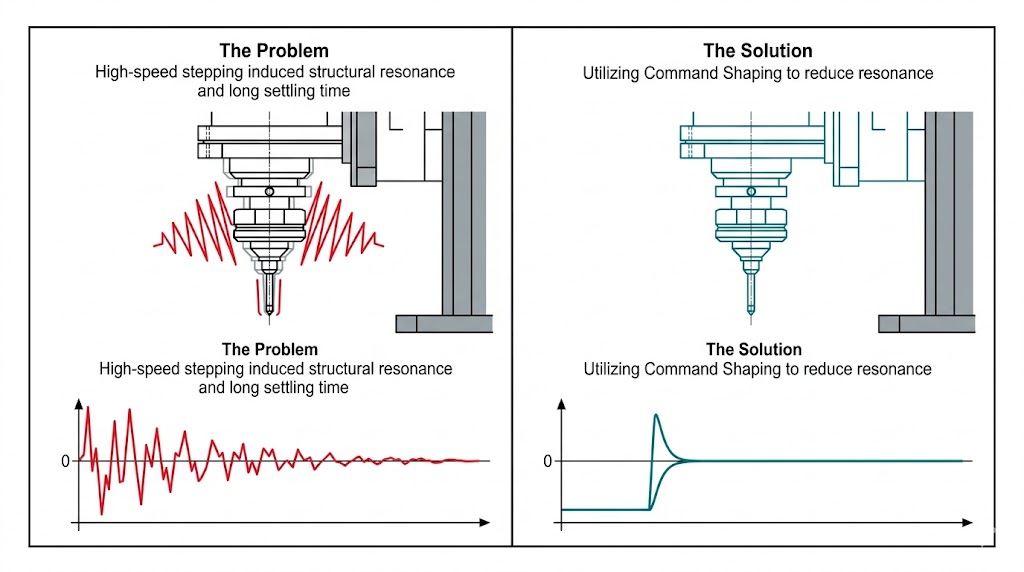 此圖比較高速步進引起的結構共振問題(左,紅色震動)與解決方案,利用「指令整形」(Command Shaping)技術(右,藍色穩定),能有效抑制震動,達成快速無共振的步進定位反應。
