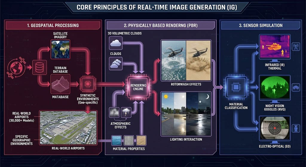 系統首先載入地形資料庫,不同於許多僅使用「典型地形(Geo-typical)」的模擬器,高階 IG 系統利用衛星影像產生「特定地理環境(Geo-specific)」的合成環境(Synthetic Environments),這表示模擬中的每一棟建築、每一條跑道都與真實世界精確對應,甚至包含全球超過 30,000 個機場的自動化模型產生。 - 物理基礎渲染(Physically Based Rendering, PBR):