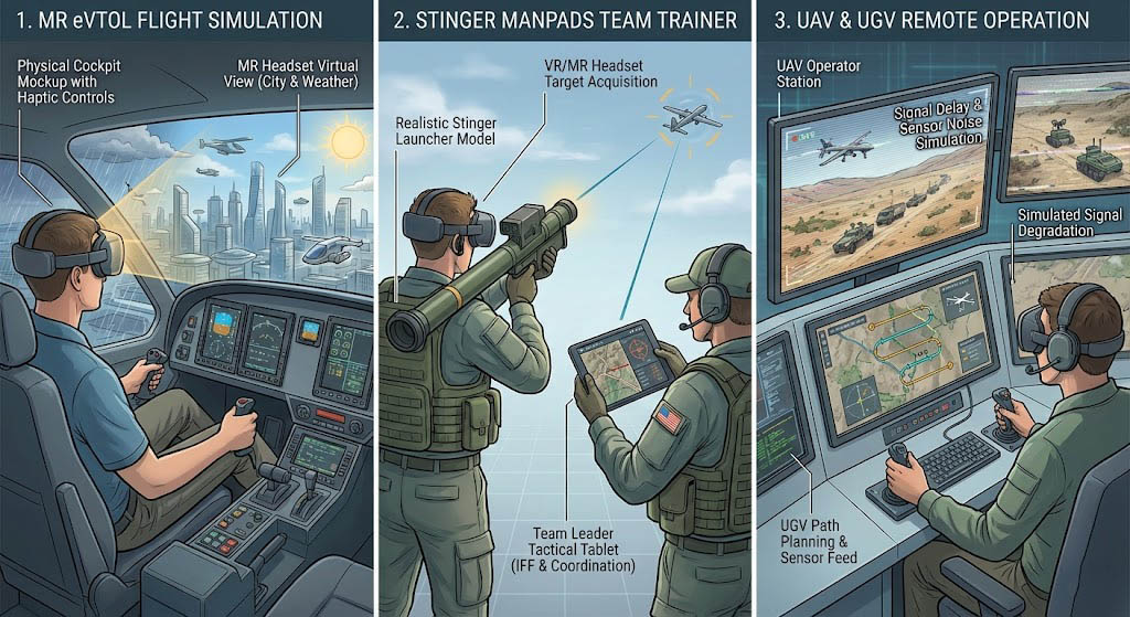 這項技術之所以至關重要,是因為它解決了傳統飛行與戰術模擬器的兩大痛點:巨大的佔地空間與高昂的維護成本,傳統的模擬器需要昂貴的圓頂投影系統(Dome Projection)來提供廣視野,而新一代的 MR 模擬器透過頭戴顯示器即可提供 360 度視角與 90fps 的高流暢度畫面,不僅大幅降低硬體成本,還能作為「一站式(Turnkey)」系統快速部署,這對於 eVTOL(電動垂直起降飛行器)、無人機(UAV)操作員以及單兵防空飛彈(如刺針飛彈)的訓練至關重要,因為它能以低成本實現「高風險、高價值」環境下的安全訓練。