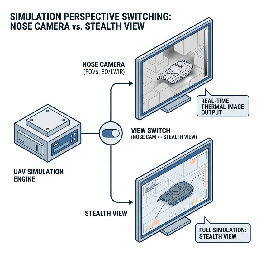 從現有的訓練與測試技術發展來看,傳統的單一視角模擬器已無法滿足現代多維度戰場的演訓需求,實務上,一名專業的無人機酬載操作員,可能需要同時監控用於基礎導航的機鼻攝影機(Nose Camera)、用於後方威脅預警的機尾攝影機(Tail Camera),以及用於目標鎖定的長波紅外線(LWIR)或電光(EO)感測器,同時在指導與戰術評估的層面,訓練教官必須擁有一個不受載具物理位置限制的「上帝視角」,亦即隱形視角(Stealth View),才能客觀地綜觀全局、評估學員的戰術決策。