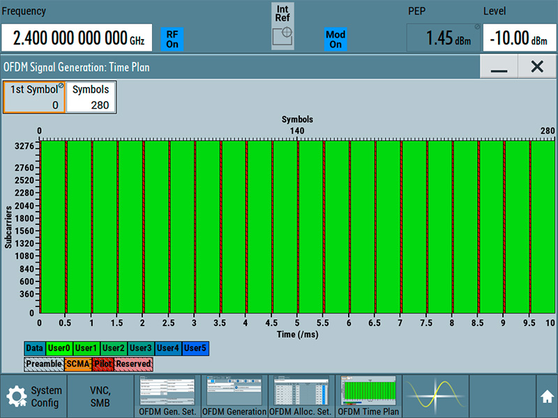 時間計畫與通用設定預覽圖:圖中為清楚展示了符碼的時間和頻率分配;下方則為客製化 OFDM 訊號產生的一般設定介面。
