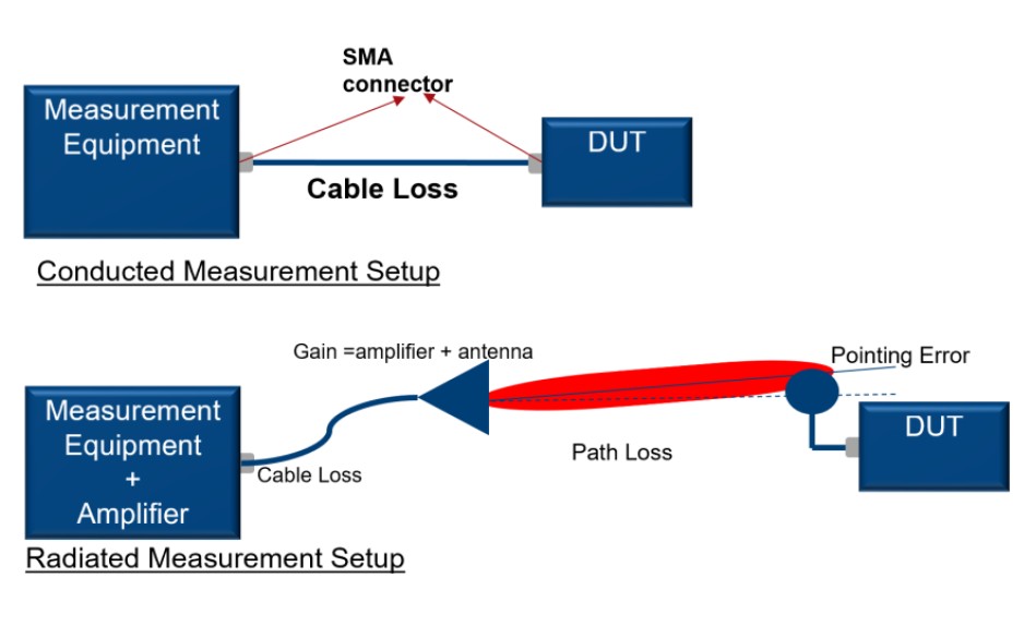 傳導與輻射測試架構對比,展示了輻射測試中需納入補償計算的關鍵因子(如路徑損耗、天線增益與指向誤差)。
