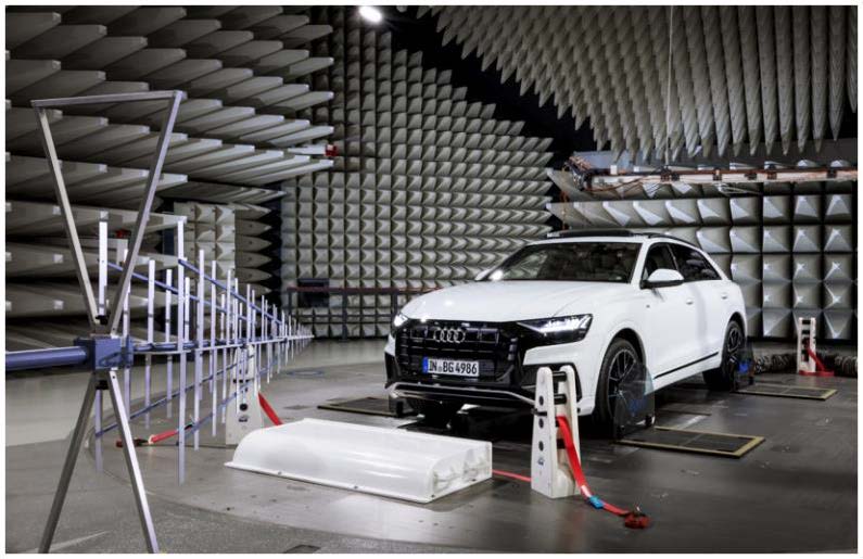 針對汽車及大型電子系統的全合規量測環境,該電波暗室配置高性能寬頻天線與轉盤系統,除了能進行高場強的 EMS 抗擾度測試外,亦可結合時域掃描(TDS)技術大幅縮短 EMI 頻譜捕捉時間,確保系統在複雜電磁環境下的相容性
