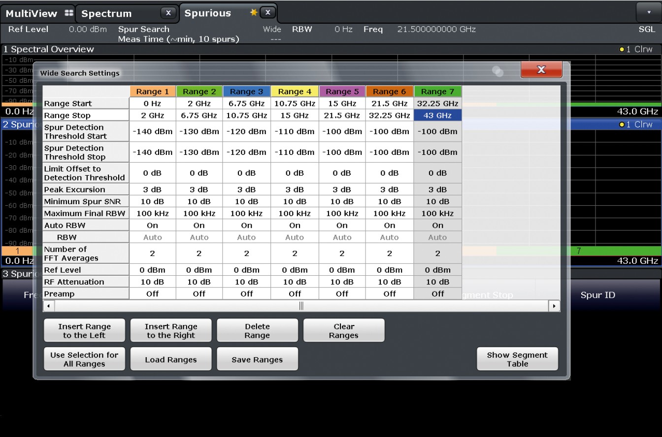 寬範圍雜散搜索設定:圖中為寬範圍雜散搜索的量測設定畫面,用戶可為每個待測的頻率範圍設定可配置參數,R&S®FSW-K50 能以清晰的結果畫面呈現雜散量測結果,並允許用戶進行深度分析。