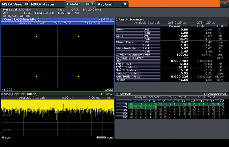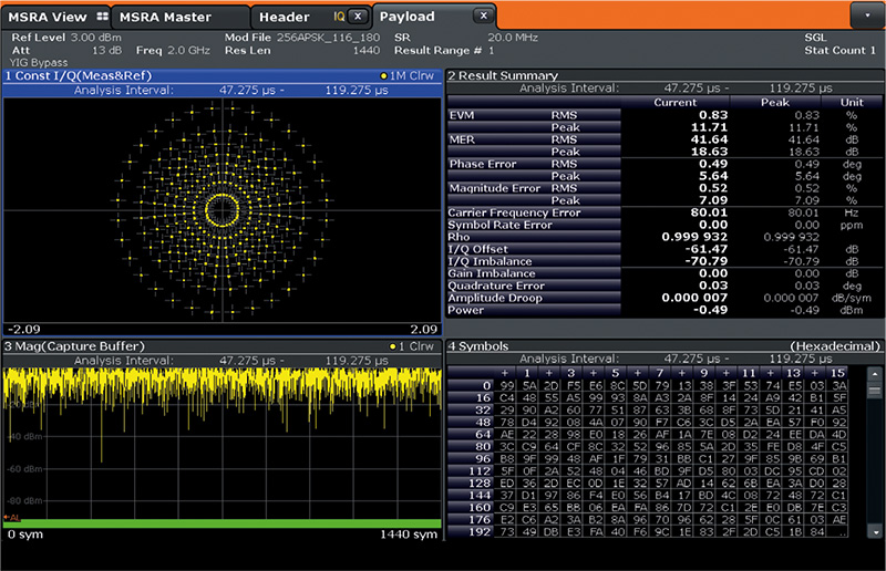 透過 R&S®FSW 的 多標準無線電分析儀 (MSRA) 模式 搭配 R&S®FSW-K70,可以在相同的 I/Q 數據基礎上,將 DVB-S2X 訊號的表頭和有效載荷數據分開解調,分析儀會在不同的視窗中顯示性能參數、星座圖等,實現對不同調變區段的獨立分析。