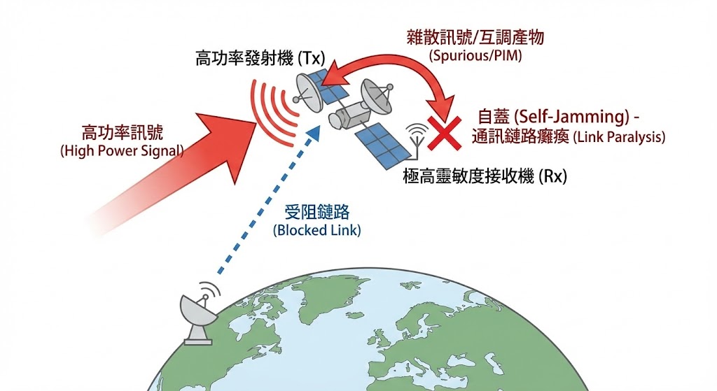 現代高通量衛星(HTS)同時搭載了高功率發射機(Tx)與極高靈敏度的接收機(Rx),由於空間限制,發射與接收天線距離極近,如果發射機的雜散訊號(Spurious Emission)或互調產物(PIM)落入接收頻段,衛星就會「自己蓋台自己」,導致通訊鏈路癱瘓。