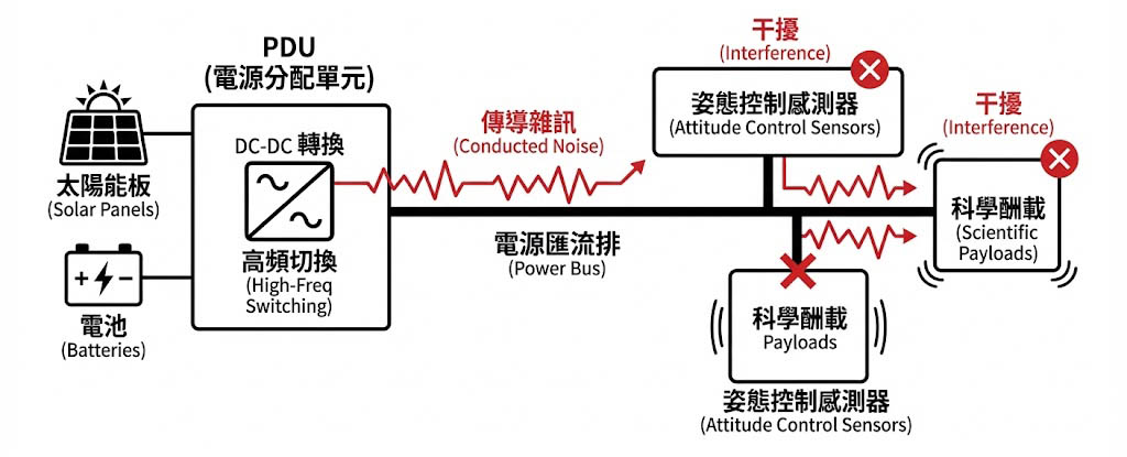 衛星內部的電源分配單元(PDU)負責將太陽能板與電池的電力轉換給各個子系統,DC-DC 轉換器的高頻切換動作會產生傳導雜訊,若不加以抑制,這些雜訊會沿著電源線傳播,干擾敏感的姿態控制感測器或科學酬載。
