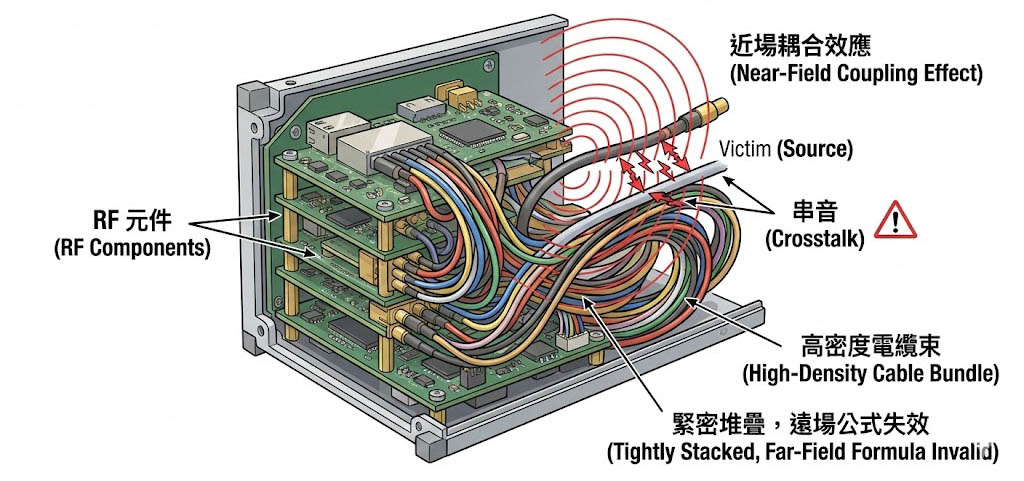 在立方體衛星(CubeSat)或小型衛星中,電纜束與射頻元件緊密堆疊,傳統的遠場輻射公式不再適用,近場耦合效應顯著,這使得「串音(Crosstalk)」問題更加難以預測。