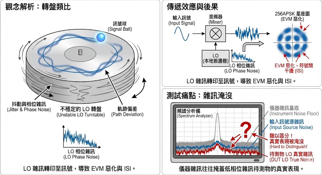 - 觀念解析:想像 LO 是一個不穩定的轉盤,訊號是放在轉盤上的球,轉盤的抖動(相位雜訊)會導致球的軌跡偏差,在寬頻通訊中,這種近載波的雜訊會導致符號間干擾(ISI),嚴重惡化誤差向量幅度(EVM)。