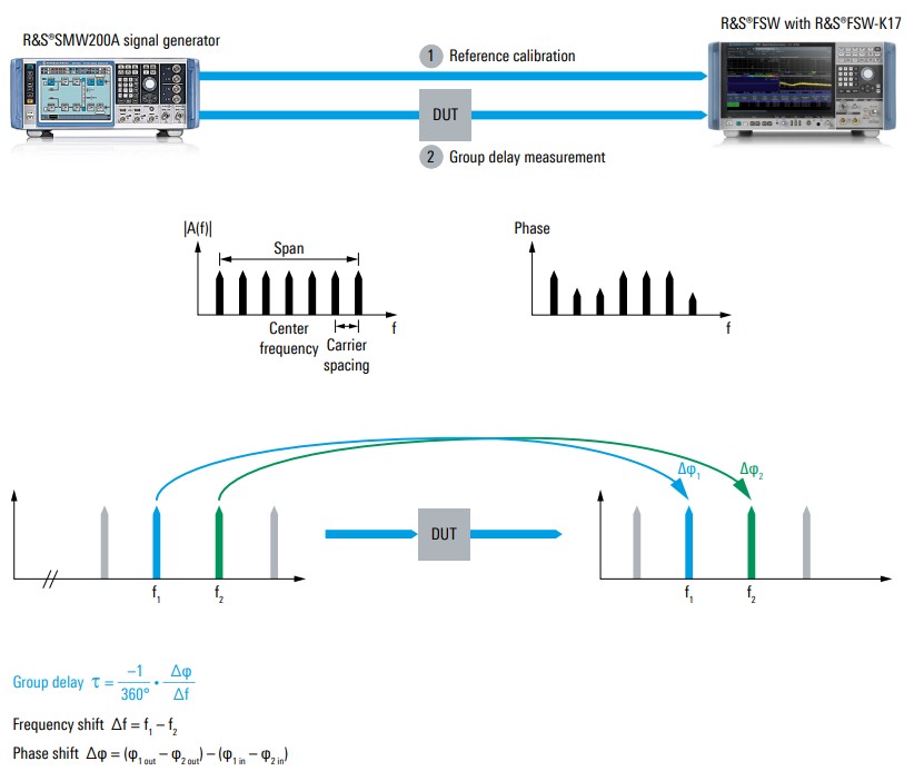 R&S FSW 頻譜分析儀和 R&S SMW200A 訊號產生器,能以快速、直接的方式量測衛星轉發器、頻率轉換器和其他組件的絕對與相對群組延遲,在多載波群組延遲量測方法中,訊號產生器會傳送一個多載波連續波 (CW) 訊號作為激勵源,載波的數量及其間距(孔徑)可以更改,以滿足待測物 (DUT) 的要求。