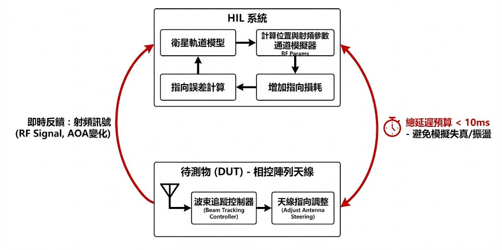 假設您正在測試一個具備「自動波束追蹤」功能的相控陣列天線,當模擬器改變了衛星的位置(改變訊號到達角 AOA),DUT 必須偵測到這個變化並控制天線轉向,HIL 系統必須讀取 DUT 的天線指向資訊,如果 DUT 指向錯誤,模擬器就必須即時增加額外的指向損耗(Pointing Loss)。 - 延遲預算(Latency Budget):