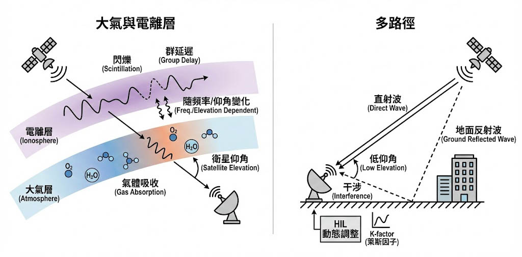 訊號穿過大氣層時會受到氣體吸收(如氧氣與水氣吸收峰),穿過電離層時會受到電子密度不均引起的閃爍(Scintillation)與群延遲,這些效應與頻率高度相關(Frequency Dependent),且隨衛星仰角動態變化。 - 多路徑(Multipath):