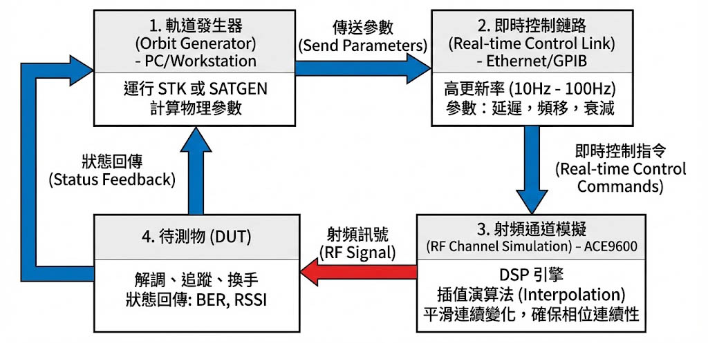 運行 STK 或 SATGEN,負責計算 時刻的物理參數。 - 即時控制鏈路 (Ethernet/GPIB):