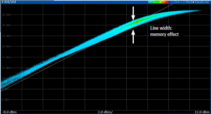 當使用數位調變訊號進行 AM/AM 量測時(如上圖的「雲狀曲線」),曲線會變得有厚度,這就是記憶效應的表現,記憶效應指放大器的輸出不僅取決於當前的輸入訊號,還取決於過去輸入訊號的歷史,這使得訊號調變失真變得更複雜、更難以預測,需要更複雜的模型來描述。