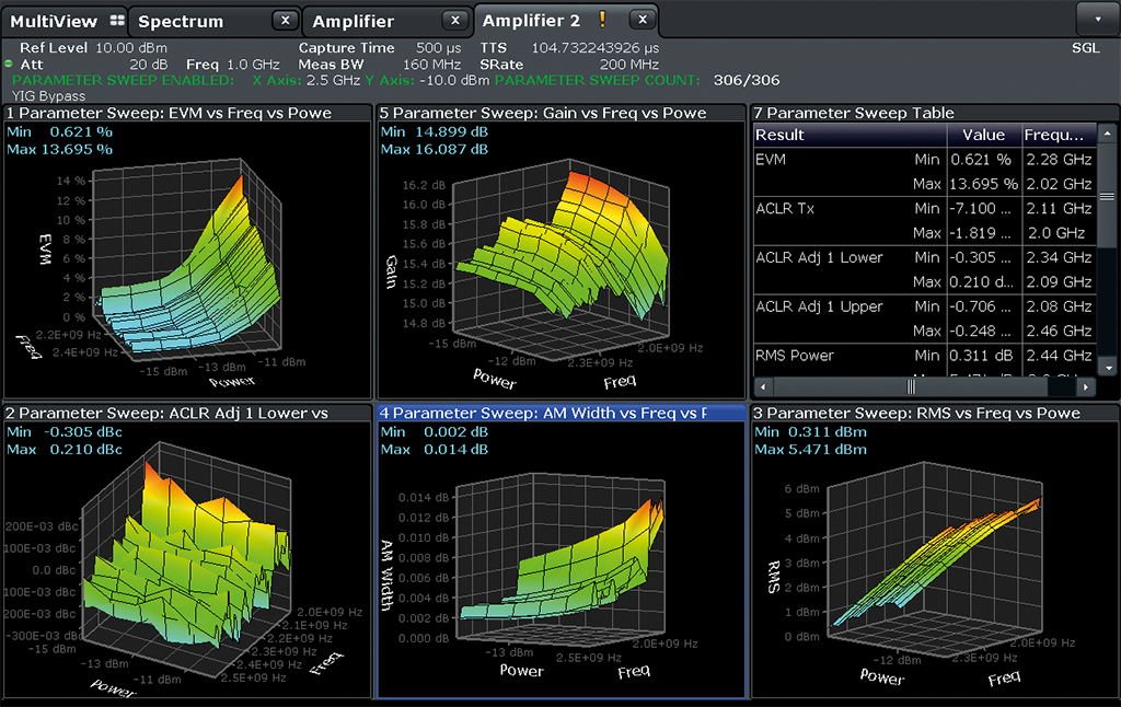 R&S FSW 訊號分析儀 3D 圖表(功率 / EVM / 頻率)能幫助您快速識別受測元件(DUT)的最佳工作點