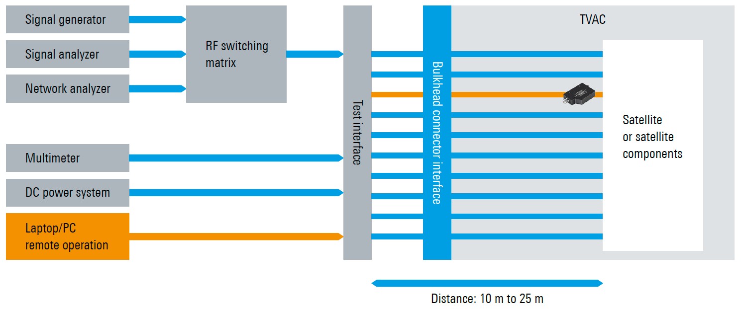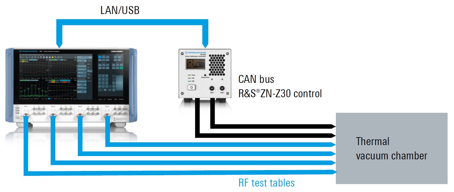 衛星酬載的合格驗證要求在熱真空腔 (TVAC) 中進行性能測試,以模擬太空的環境與極端溫度;如前所述,商用的現成測試測量設備(例如頻譜分析儀、向量網路分析儀、訊號產生器等)無法在 TVAC 條件下工作,必須留在腔體外,並透過長纜線連接到腔體內的 DUT;由於腔體內部的纜線、轉接頭和開關的特性會隨著溫度變化而漂移,在不同溫度下執行的校準將不再有效,在纜線移動和溫度變化之後,定期重新校準是確保量測準確性的必要條件。
