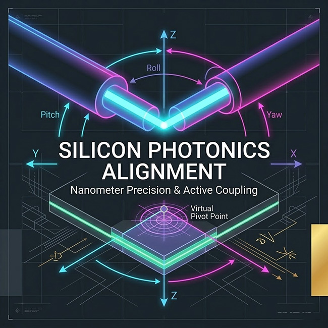 在進行邊緣耦合時,對位系統必須具備六個自由度:三個線性平移(X、Y、Z)與三個旋轉角度(俯仰、偏擺、滾轉),傳統的機台設計往往採用層層堆疊的線性滑台與旋轉台來實現這六個自由度,然而在矽光子測試實務中,這種「串聯運動學」設計會引發一個致命的物理矛盾:空間干涉與寄生位移。