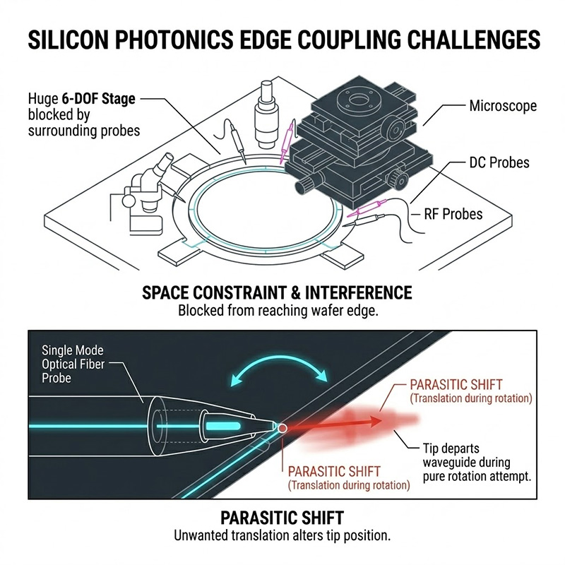 首先是空間受限,在晶圓級測試環境中,探針台內部同時佈滿了高頻射頻探針、直流電源探針與顯微鏡鏡頭,巨大的堆疊式光學對位平台根本無法靠近晶圓邊緣,更關鍵的是「寄生位移(Parasitic Shift)」問題,在光學對位中,工程師需要光纖的尖端精準地繞著矽波導的入光口進行純粹的角度旋轉調整,以尋找最佳的入射角。