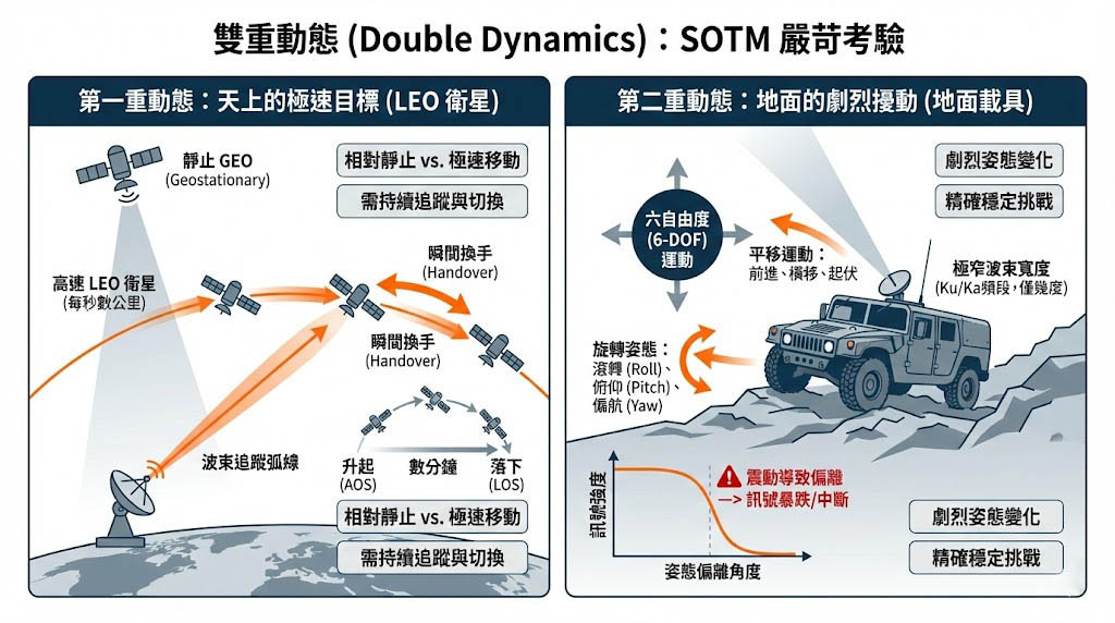 當通訊產業邁入 B5G 與 6G 時代,無縫覆蓋的願景將極大程度依賴於「移動中衛星通訊(Satellite-on-the-Move, 簡稱 SOTM)」,無論是行駛在偏遠山區的越野車、執行救援任務的直升機,還是在惡劣海象中航行的遠洋貨輪,都需要透過車頂或船桅上的衛星終端保持寬頻連線;然而,從靜態的地面站轉變為動態的 SOTM 終端,工程師面臨的是一場與物理學和幾何學的極限對決,這被稱為 「雙重動態(Double Dynamics)」 挑戰。