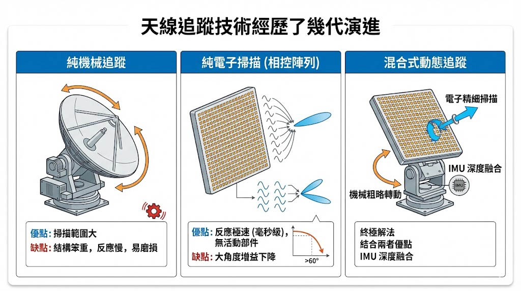 為了解決這個問題,天線追蹤技術經歷了幾代演進: