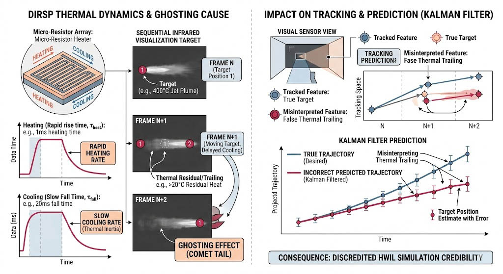 這裡存在著一個殘酷的熱力學物理限制:微型電阻加熱器通電產生高溫的速度相對較快,但要讓這個微觀結構在真空中迅速散熱冷卻,卻只能依賴極其緩慢的熱傳導基座,當演算法要求某個像素在上一幀模擬攝氏四百度的引擎尾焰,而在下一幀立刻冷卻至零下二十度的天空背景時,如果微電阻的「像素下降時間(Fall Time)」不夠短,熱能將會殘留在該像素上, 這會導致物理現象上的「熱拖影」——原本應該已經飛離該座標的高溫目標,在紅外線畫面中留下了一道宛如彗星尾巴的虛假熱軌跡,這種由測試設備自身熱慣性造成的偽影,會被待測物的追蹤演算法誤判為目標的真實特徵,導致卡爾曼濾波器(Kalman Filter)計算出錯誤的預測軌跡,最終讓耗資巨大的 HWIL 模擬失去物理公信力。