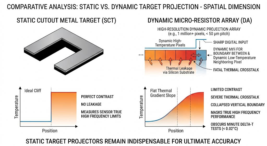 當我們試圖在動態陣列上生成一條極度銳利的邊緣(例如左邊像素設定為極高溫,右邊相鄰像素設定為極低溫)以進行類似靜態 MTF 的解析度測試時,高溫像素產生的龐大熱能,會無可避免地透過底層的矽基板或周遭輻射,洩漏至相鄰的低溫像素,這種物理洩漏導致原本應該是垂直峭壁般的溫度邊界,坍塌成平緩的熱梯度斜坡。 這表示動態微電阻陣列先天上無法提供如同「靜態鏤空金屬標靶」那般完美的絕對對比度,當工程師需要精確量測系統的高空間頻率極限,或是需要進行極微小溫差(小於百分之二度)的靈敏度測試時,動態陣列的熱串擾與背景雜訊會徹底掩蓋感測器的真實效能,這正是為何即使動態投影技術再先進,國防實驗室依然絕對無法捨棄靜態目標投影器的根本物理原因。