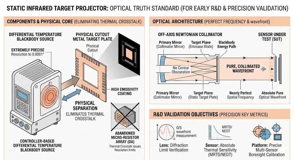 當測試任務處於研發初期,重點在於驗證光學鏡頭的繞射極限、感測器的絕對熱靈敏度(MRTD/NEDT)或是進行精準的多感測器視軸校準時,系統必須配置「靜態紅外線目標投影器」, 此配置的物理核心在於「極致的幾何對比與熱穩定性」,系統拋棄微電阻陣列,改採具備高發射率塗層的實體鏤空金屬目標板,並搭配極端精準(解析度達萬分之一度)的差動溫度黑體輻射源,由於金屬標靶與黑體之間的物理分離,徹底消滅了熱串擾的問題;結合無中心遮蔽的離軸牛頓式準直儀,這套靜態架構能提供近乎完美的空間頻率與絕對純淨的光學波前,是建立系統光學真理的唯一標準。