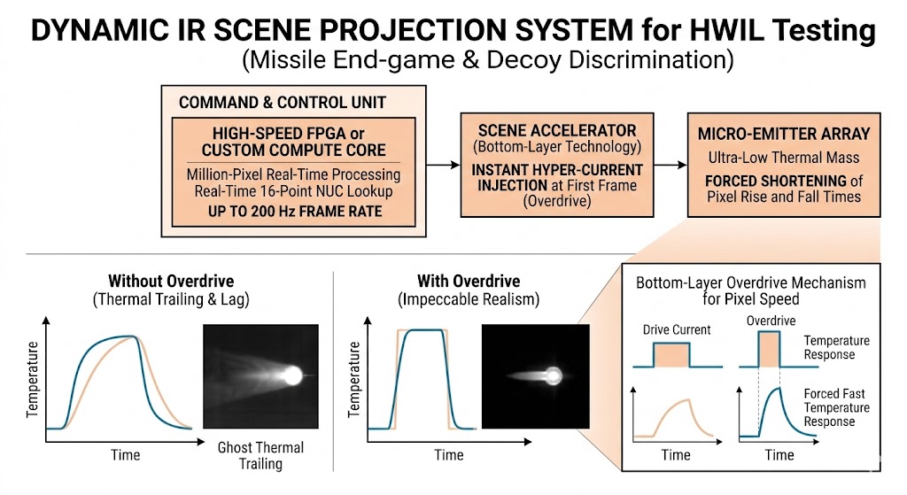 當系統進入後期的硬體迴路(HWIL)測試,需要驗證飛彈的末端導引邏輯或反制誘餌的辨識能力時,測試架構必須轉向「動態紅外線場景投影系統」, 為了對抗熱拖影與遲滯,此架構必須配置具備極低熱質量的微型發射器陣列,並在硬體底層導入「場景加速器(Scene Accelerator)」技術——透過在溫度轉換的第一幀瞬間注入超額的驅動電流(Overdrive),強行縮短像素的上升與下降時間,同時系統必須配置搭載高速 FPGA 或客製化運算核心的命令控制單元,確保在最高可達兩百赫茲的幀率下,依然能對百萬像素執行即時的十六點 NUC 查找運算,從而確保投射出的動態高溫目標具備無懈可擊的真實度。