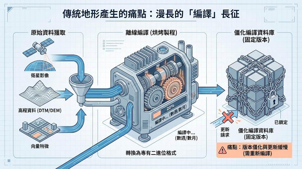 收集衛星影像(Sat Imagery)、高程資料(DTM/DEM)與向量特徵(Vector Features)。 - 離線編譯(Offline Compilation):