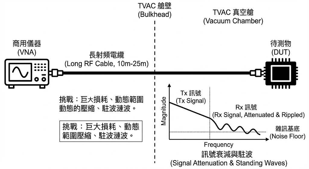 標準的商用測試儀器(COTS),如向量網路分析儀(VNA)或頻譜分析儀,其設計並非為了在真空或極端溫度下運作,它們的散熱依賴空氣對流,且內部的電解電容與液晶螢幕在真空中會失效或破裂,因此儀器必須放置在 TVAC 艙外,這導致了一個物理上的必然:必須使用極長的射頻電纜(通常長達 10 公尺至 25 公尺)穿過艙壁(Bulkhead)連接到艙內的待測物(DUT