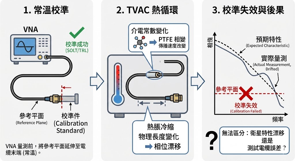 這是最致命的問題,在進行 VNA 量測前,我們都會進行嚴謹的系統誤差校正(SOLT 或 TRL 校準),將參考平面(Reference Plane)延伸到電纜末端,然而,這個校準是在「常溫」下進行的。