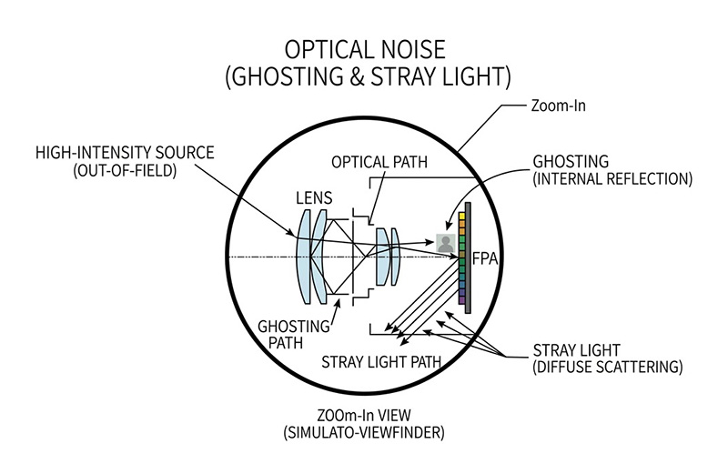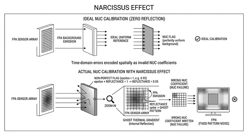 無人機內部的非均勻性校正(NUC)快門(Flag)與感測器周邊的冷屏,必須作為一個絕對的熱力學零點或均勻基準, 若這些元件表面的紅外線發射率未達完美(例如僅有 0.95),代表其具備高達百分之五的反射率,對於極度敏感的 LWIR 感測器而言,這百分之五的反射率會讓感測器「看見」自己陣列散發出的本底熱能,或是反射出電路板運作時的不均勻熱梯度,這種被稱為 鬼影效應(Narcissus Effect的自我熱反射,會將虛假的幾何熱圖案投射至畫面上,當系統執行自動 NUC 校正時,這些因內部反射產生的幽靈熱梯度會被錯誤地寫入補償矩陣中,導致無人機在觀測平坦背景時,畫面上永遠存在著無法抹除的固定模式雜訊(FPN)。
