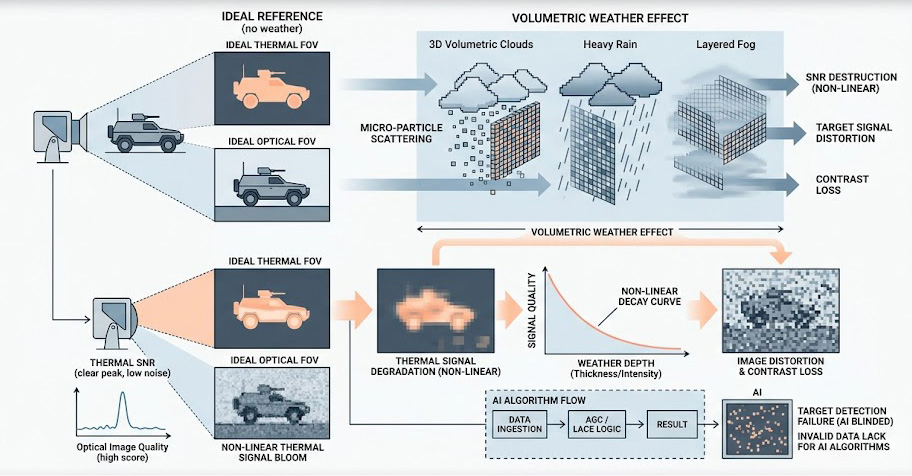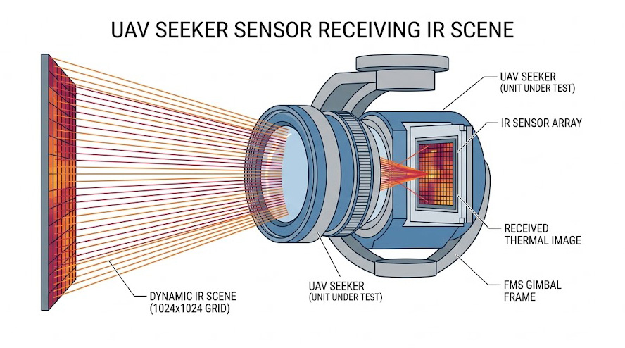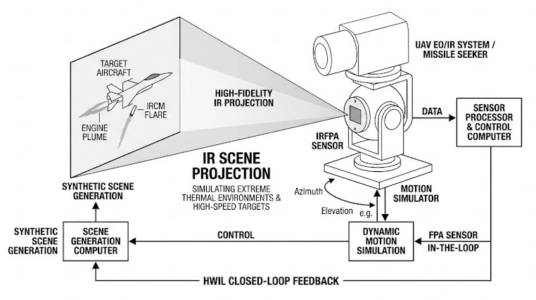 進入 2026 年,先進無人載具 (UAV) 的光電/紅外線 (EO/IR) 系統與飛彈尋標器面臨著極度複雜的戰場環境,這些感測器必須在高速移動中,準確辨識並追蹤動態目標,同時應付如引擎尾焰、火箭噴流或高強度紅外線反制措施 (IRCM) 所產生的極端熱輻射變化;在真實的實彈演習或野外環境中測試這些高階 IRFPA (紅外線焦平面陣列) 系統,不僅成本極其高昂、潛藏著巨大的飛安危險,且天候與大氣條件的不可控性,也讓測試結果難以具備客觀的可重複性;因此,軍規驗收標準強制要求,下一代無人機與飛彈系統必須在實驗室的硬體迴路 (Hardware-in-the-Loop, HWIL) 環境中,進行高保真度的合成影像閉迴路測試。
