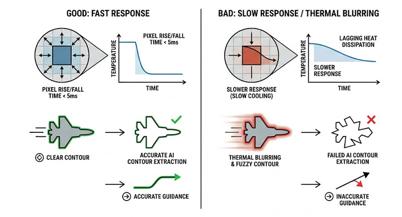 無人機的追蹤演算法需要即時運算目標的相對角速度,在 HWIL 測試中,場景投影器必須支援高達 200 Hz 甚至 400 Hz 的超高幀率,以配合待測物 (UUT) 的取樣頻率並消除空間-時間取樣偽影,這在物理上要求投影器的每一個微小像素,其溫度的上升與下降時間 (Rise/Fall Time) 必須小於 5 毫秒 (5ms),若發射器的熱質量過大,導致降溫速度跟不上幀率切換,高速移動的目標就會在紅外線畫面上留下嚴重的「熱拖影」,這會使無人機的邊緣 AI 演算法無法準確提取目標輪廓,進而輸出錯誤的導引指令。